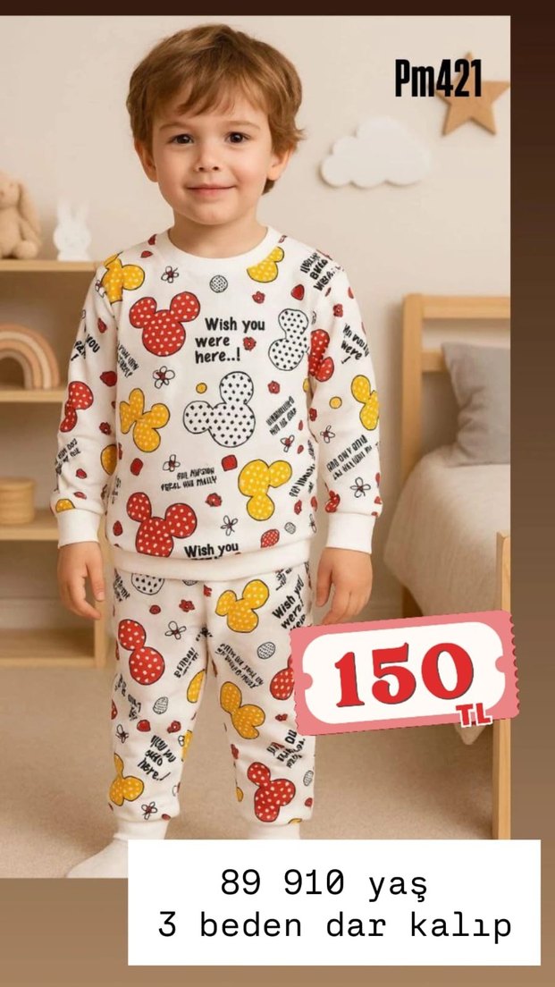 Beyaz pamuklu kumaştan, renkli baskılı çocuk pijama takımı. Uzun kollu üst ve desenli pantolon içerir. ️