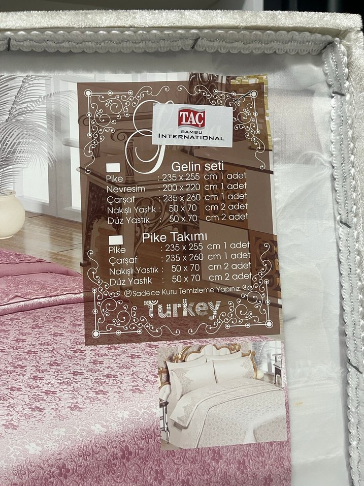 Beyaz renginde baskılı pike takımı; 1 adet pike, 1 adet çarşaf, 2 adet nakışlı yastık ve 2 adet düz yastık içerir. TAC markalı, sadece kuru temizleme önerilir.sandık da verilmektedir