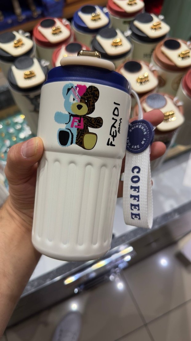Renkli ayı desenli, beyaz çocuk termosu. "COFFEE" yazılı askısı bulunur. Fendi temalıdır. ☕