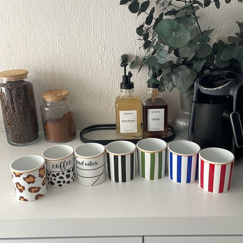 !!!!!!! Tanesi 130 ₺ !!!!! Beyaz seramikten yapılmış, çeşitli renkli desenlere sahip fincan seti. Çizgili, leopar ve yazılı farklı tasarımlar içerir. ☕ iki defa kullanılmıştır tanesi 130 ₺ ihtiyaç dışı satılıktır toplu olursa fiyat konuşulur