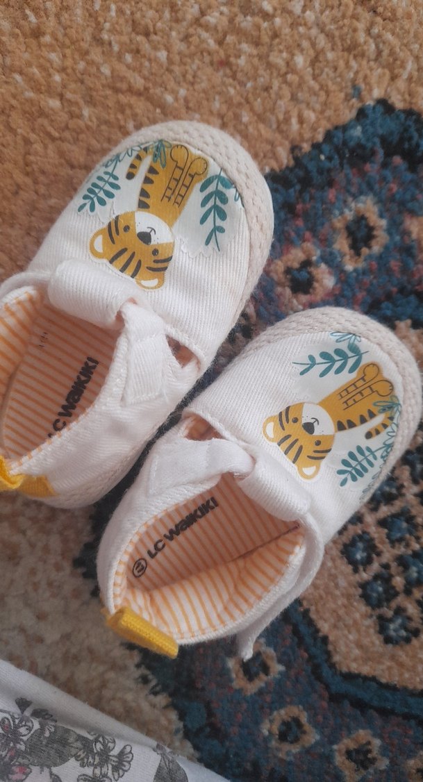 Beyaz renkte, renkli kaplan desenli erkek bebek ilk adım ayakkabısı, kolay kullanım sağlayan cırt cırtlı ve kauçuk malzemeden üretilmiştir.