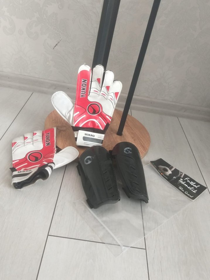Renkli baskılı deri erkek çocuk kaleci eldivenleri, Velcro bantlıdır. Siyah kaval koruyucularla birlikte gelir. ⚽ tekmelik sıfır paketinde . eldiven sadece 1 kez kullanıldı. 7 yaş için uygundur .
