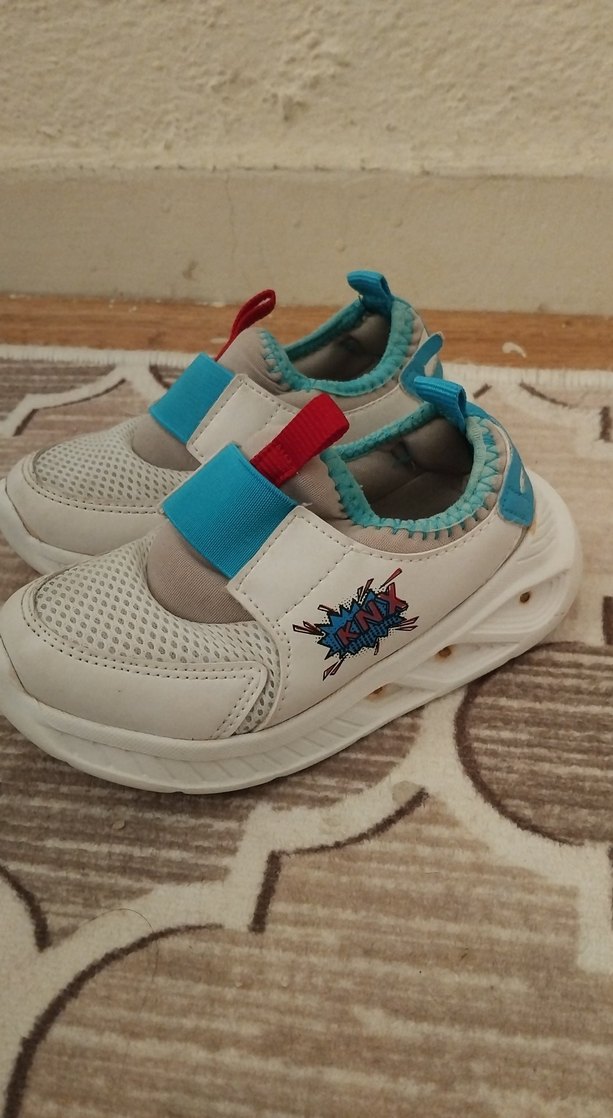 Erkek çocuk ışıklı spor ayakkabısı, renkli baskılı desen ve kolay kullanım için lastikli bantlara sahiptir. Kauçuk tabanlı, nefes alabilen üst yüzeye sahiptir.