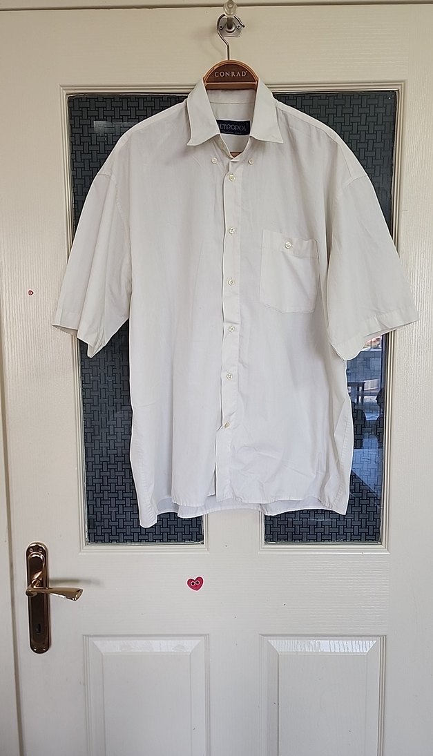 beyaz renkli, düğmeli, kısa kollu, pamuklu kumaştan yapılmış, normal boyda erkek gömleği. Ofis ve günlük sokak stiline uygundur. boy 77 cm iki kol arasi 67 cm