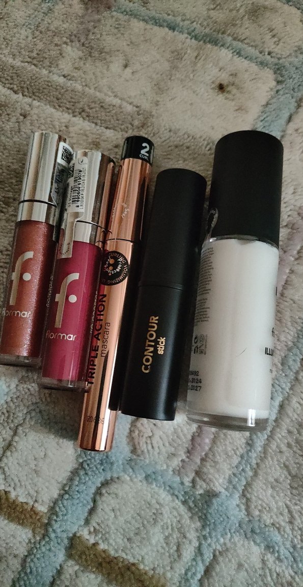 Beyaz renkli Formar marka ruj, kontür stick, maskara ve parlak lipgloss içeren makyaj seti. set halinde satılıktır hepsi sofırdır