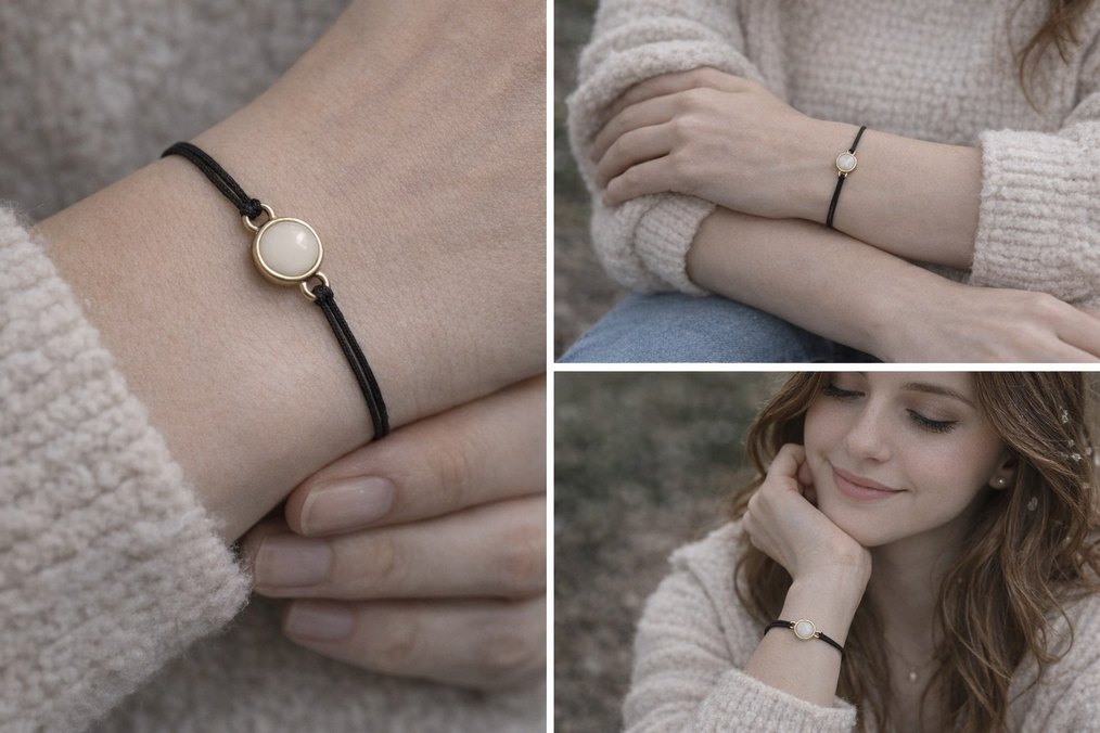 Beyaz renkte, siyah bantlı yuvarlak taş detaylı gevşek fit bileklik. Sade tarzıyla günlük kıyafetlere uyum sağlar.
