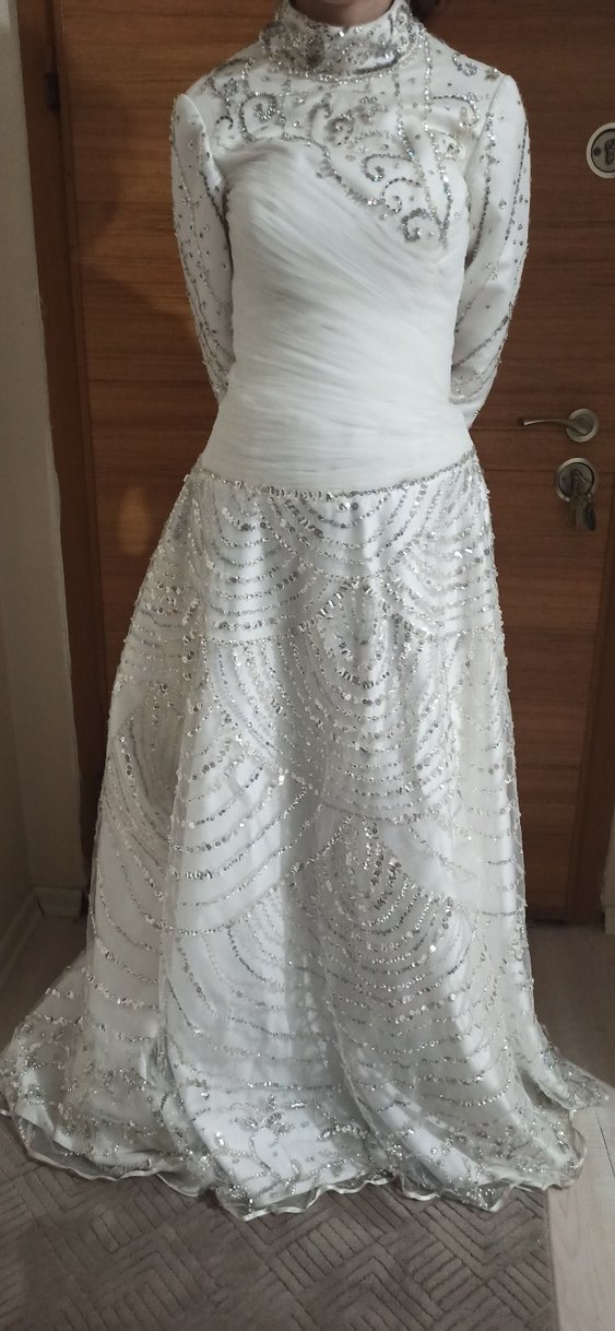 Döneminde ciddi bir rakama Ankara Çankaya Naz Modaevi'nde özel tasarlanmıştır. Sırt kısmında lekelenme mevcuttur, kuru temizleme yapılmadı, yapılması önerilir. Haricinde herhangi bir defosu yoktur Fotoğraflarda tarlatan yoktur ancak gelinliğin ayrıca tarlatanı mevcuttur