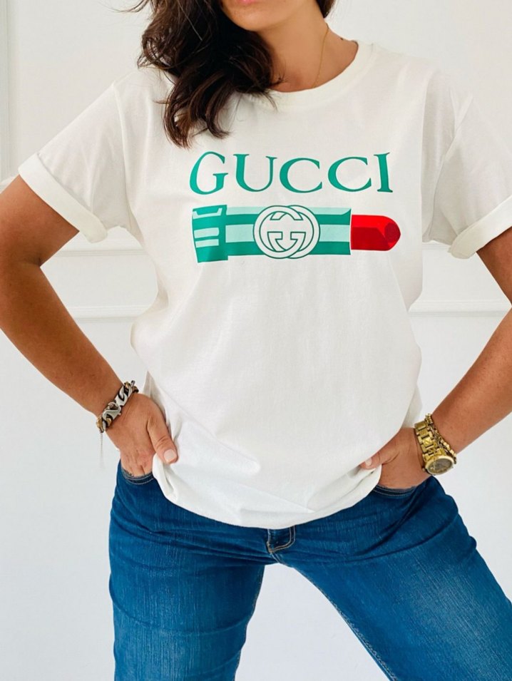 Beyaz Renkli Gucci Baskılı Kadın Tişört