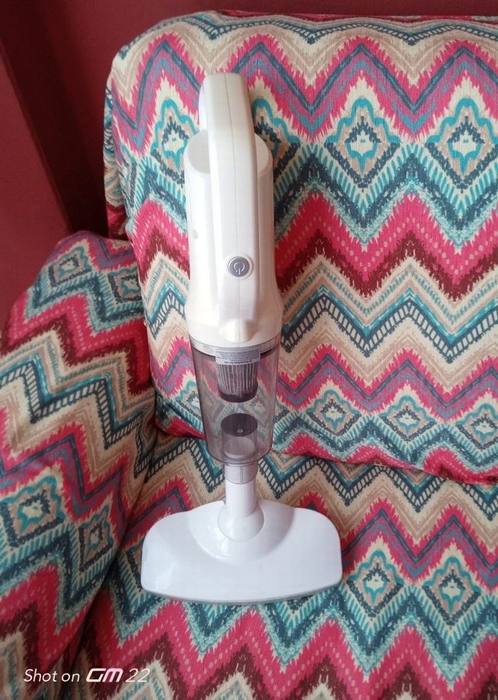 Beyaz renkli kablosuz elektrikli süpürge, şeffaf toz haznesi ve kompakt tasarımıyla hızlı temizlik sağlar. Hafif ve kullanımı kolaydır.
