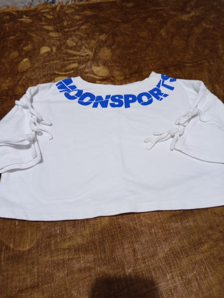 Beyaz renkli, uzun kollu kadın tişörtü; yuvarlak yaka, renkli baskı ve rahat kesime sahip. Kısa boyu ve yumuşak kumaşıyla spor şıklık sunar.