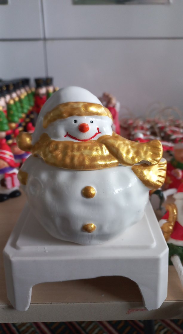 Beyaz renkte, altın rengi parlak atkı ve şapka detaylarına sahip kar adam biblosu. Neşeli yüz ifadesi ve kırmızı burun ile düğmeleri bulunur. ⛄