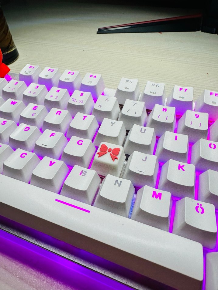 Renkli ışıklı beyaz oyun klavyesi, kırmızı fiyonk tuşu ile özel tasarım. Oyun deneyimini artırır .