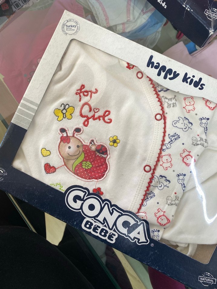 Renkli baskılı desenlere sahip pamuklu bebek uyku seti, 'for girl' yazılı sevimli salyangoz figürü içerir. Türkiye yapımıdır.