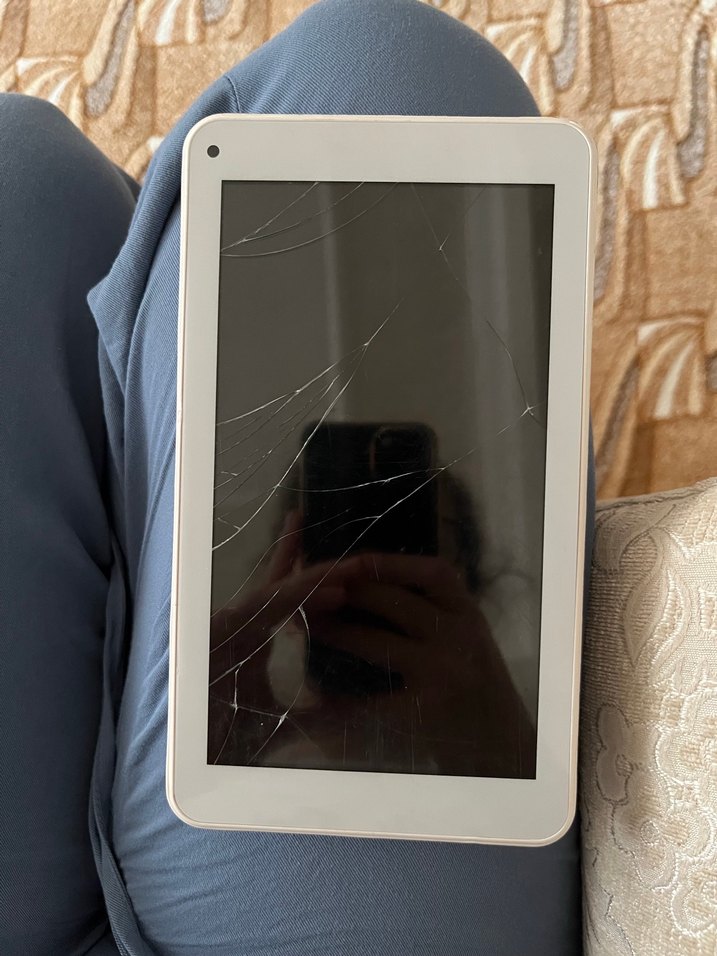 Beyaz renkli tablet, ekranında çatlaklar bulunuyor. Kompakt boyutlarda, temel kullanım için uygun.