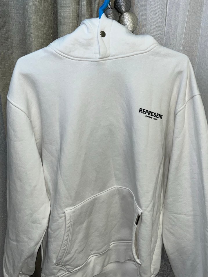 Beyaz renkli Represent sweatshirt, yuvarlak yaka ve uzun kolludur. Rahat kesimi ve fermuarlı detayıyla yumuşak, sıcak dokuda üretilmiştir. Önünde "REPRESENT" yazısı bulunur.