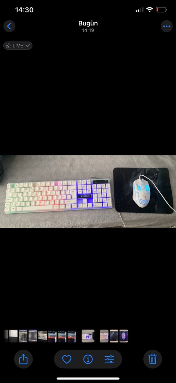 RGB aydınlatmalı beyaz klavye ve mavi detaylı beyaz kablolu mouse, siyah mouse pad üzerinde yer alıyor mouse hiç kullanılmadı Kılavye max 20 saat kullanıldı