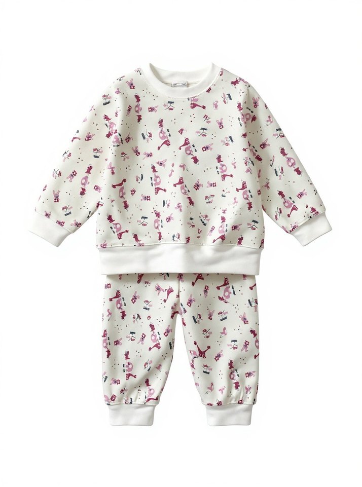 Uzun kollu, pastel tonlarda beyaz ribanadetaylı bebek kız takımı, rahat ve şık bir seçimdir.