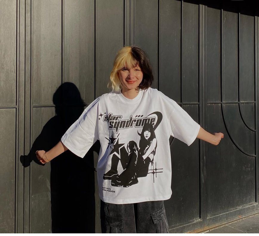 Beyaz Rock Punk Baskılı Oversize Tişört