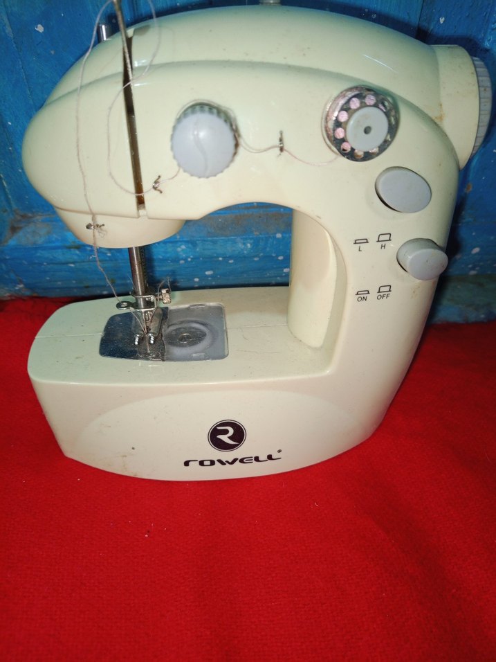 Basit kontrol düğmelerine ve kompakt tasarıma sahip beyaz Rowell dikiş makinesi.