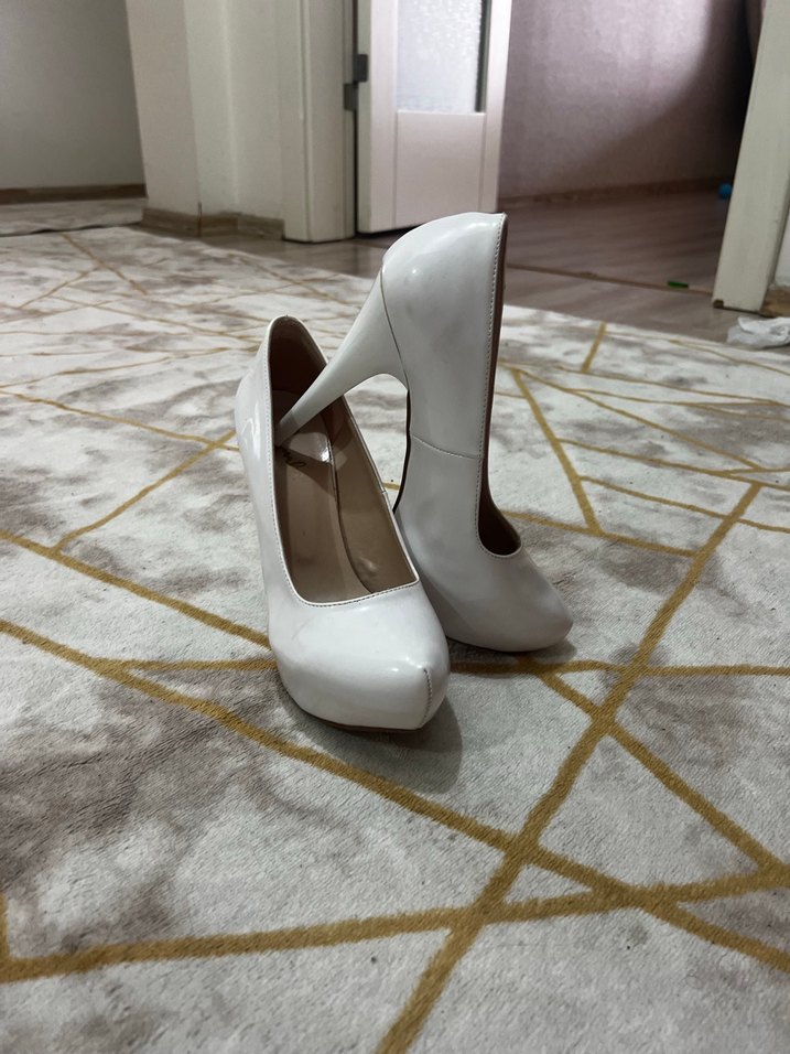 Düğünler için beyaz rugan stiletto topuklu ayakkabı. Minimalist tasarımlı, kauçuk malzemeden, çağdaş ve klasik şıklık sunar. 1 kez giyildi.