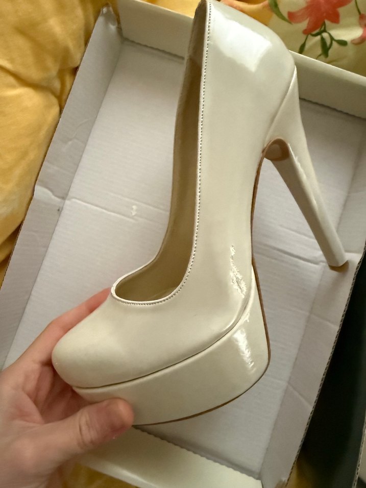Parlak beyaz rugan stiletto topuklu ayakkabı, yüksek topuk ve platformlu, kauçuk ayakkabı. Özellikle abiye ve düğünlere uygun :) O kadar temiz ki yatağın üzerinde foto çektim :) sadece 1 kez giyildi ancak alışkın olmadığım için bir saat bile durmadı ayakta. Birkaç yerinde hafif sürtünme aşınmaları var. Sanırım durdukça olmuş. Fotolarda gösterdim. 38.5 numara. 38 ve 39 için bence uygun.