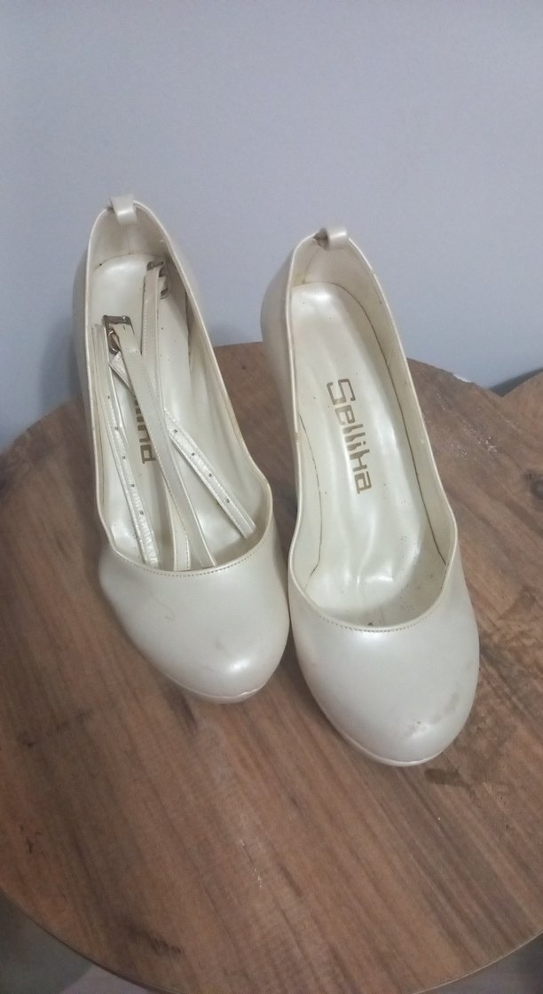 Beyaz parlak rugan stiletto topuklu, tokalı kayışlı. Klasik vintage tarz, düğünler için uygun, SelliHa markası.