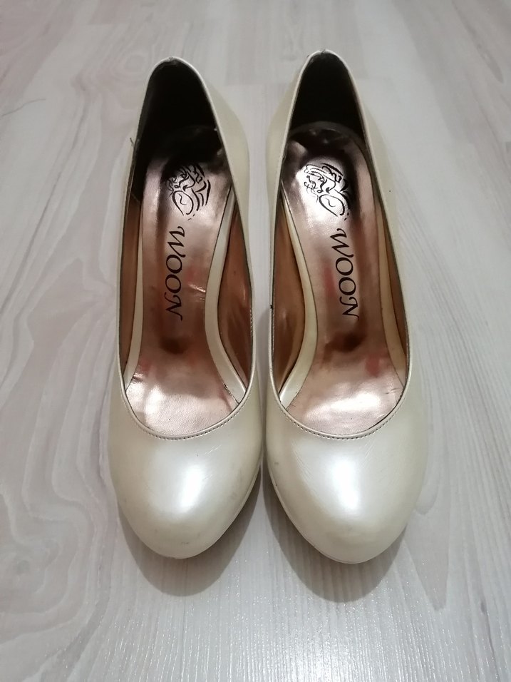 WOON markalı beyaz rugan stiletto topuklu 36 NUMARA ayakkabı, parlak yüzeyi ve modern klasik tarzıyla düğün ve özel günler için şık bir seçimdir. çok az geldi Yeni gibi Gelinlik altına giymek için uygundur.