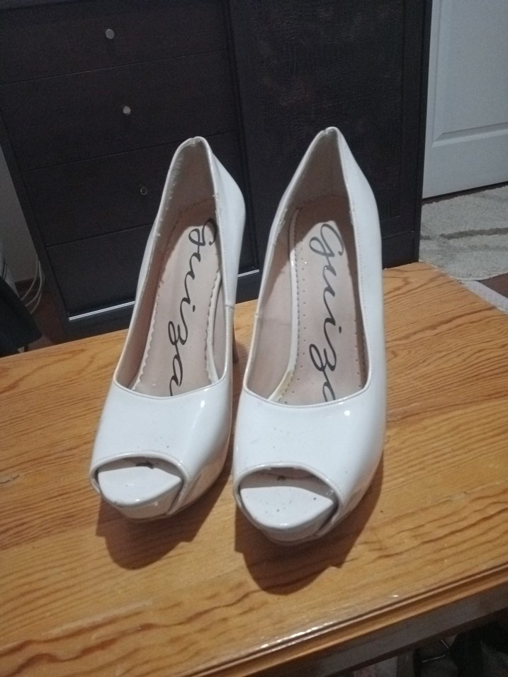 Beyaz rugan stiletto topuklu ayakkabı, parlak görünümlü ve tokalı detaylıdır. Düğün ve sokak tarzına uygundur, klasik şıklık sunar.