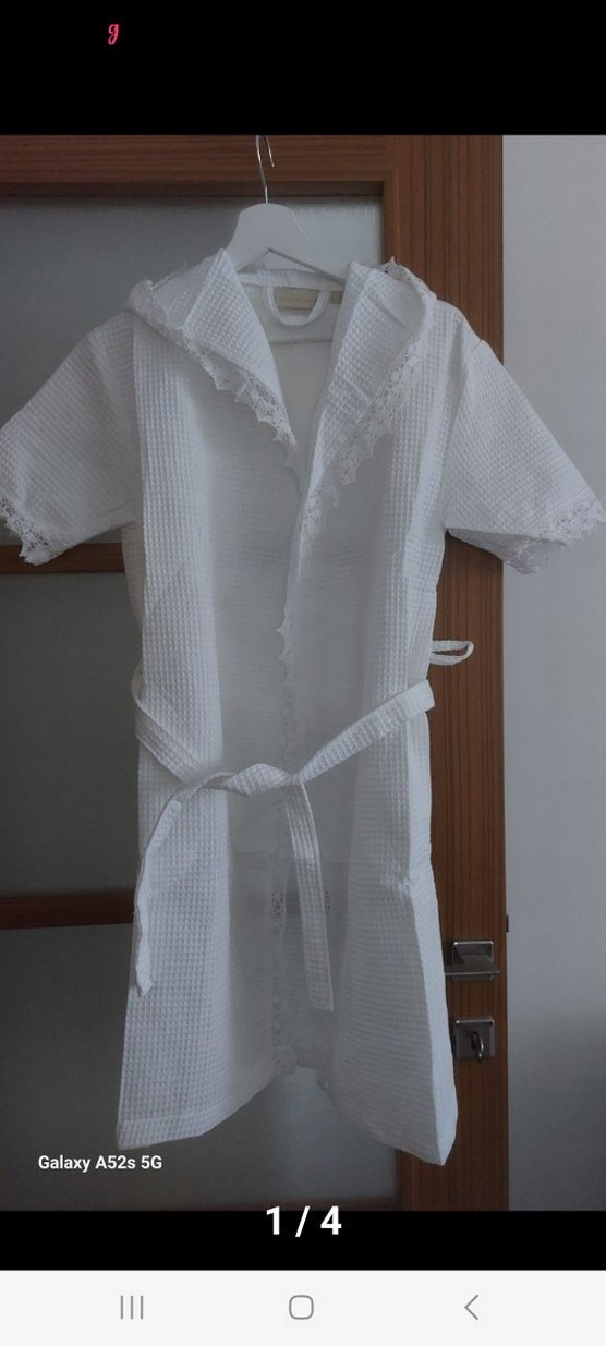 Bu beyaz yazlık bornoz ve ya sabahlık, yakasında ve kollarında dantel detaylar bulunan dokulu kumaşa sahiptir. Ayarlanabilir kemerli klasik stilde bir üründür.
