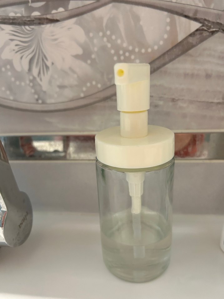 Şeffaf gövdeli, beyaz pompalı sabun şişesi. Sabunların kolayca dağıtılmasını sağlar.