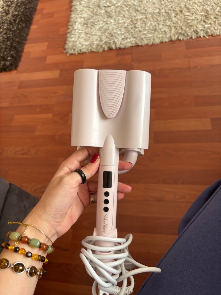 Beyaz renkte, dijital ekran ve çoklu kontrol düğmeleri bulunan kompakt saç şekillendirici cihaz. ♀️