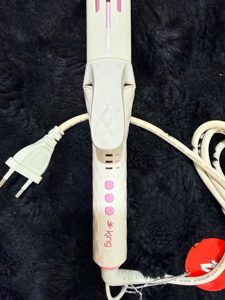 King markalı beyaz saç şekillendirici, ayarlanabilir ısı ayarları ve rahat tutuş sunar. Güç kablosu ve kontrol düğmeleri bulunur. ♀️