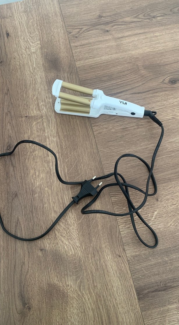 Beyaz gövde ve altın renkli plakalarla saç şekillendirici maşa. Uzun siyah kablo ve fiş içerir. Dalgalı ve kıvırcık saçlar için uygundur. ♀️