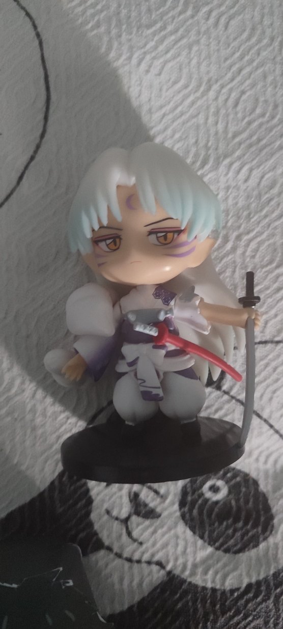 Bu aksiyon figürü, beyaz saçlı ve kılıç tutan detaylı yüz işaretlerine sahip. Siyah tabanda duruyor. ⚔️