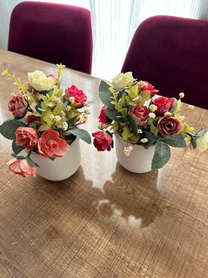 İki beyaz saksıda, kırmızı, pembe ve krem tonlarında pastel renkli yapay çiçekler ve yeşil yapraklar bulunur.