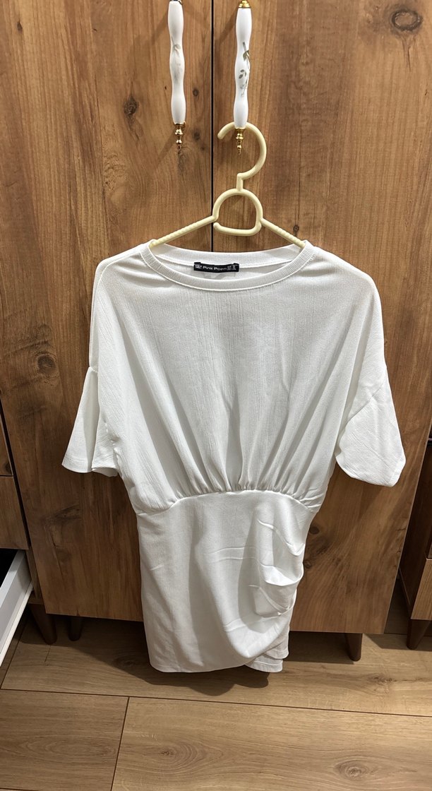 Beyaz keten, bisiklet yaka ve kısa kolludur. Salaş kesimi ve drapeli detaylarıyla mini boydadır, rahat sokak stili için uygundur.
