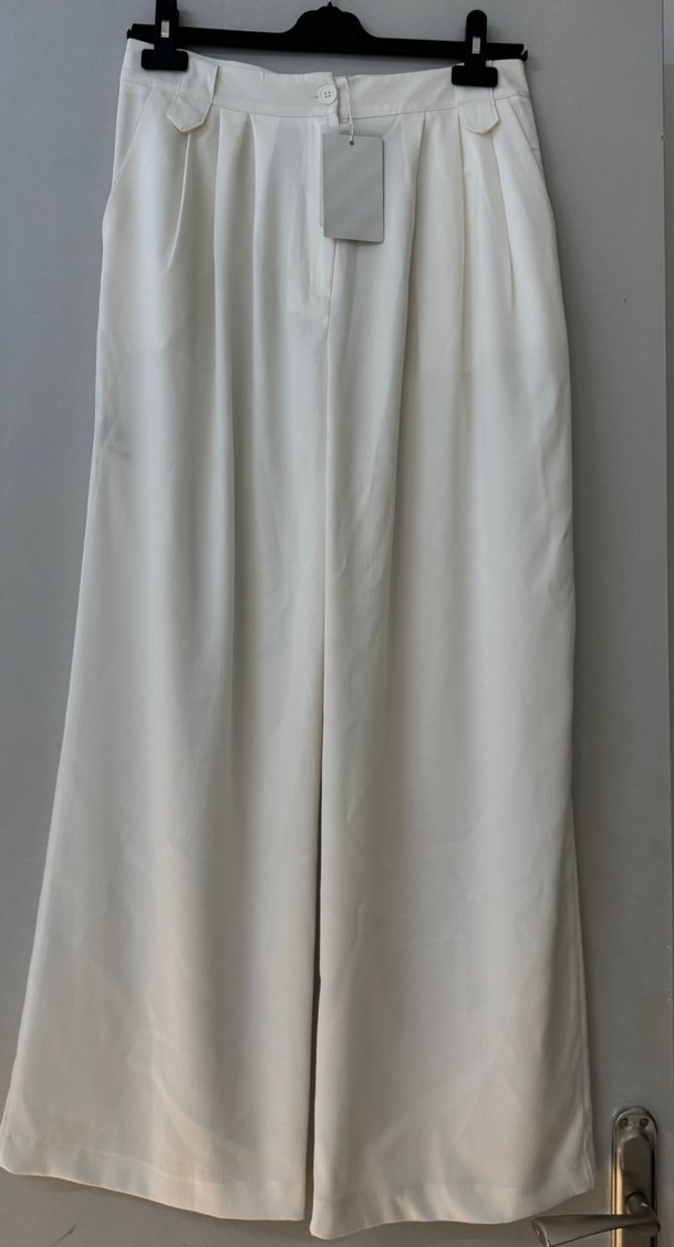 Ofis kullanımı için uygun, beyaz, salaş kesim, saten dokulu ve drapeli kadın kumaş pantolon. Minimalist ve desensiz tasarım.