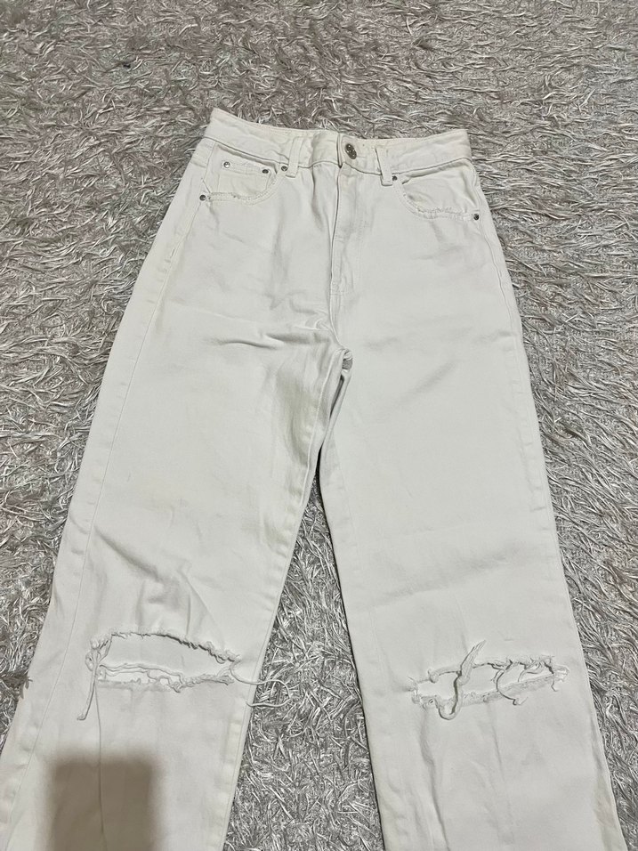 Salaş kesim, midi boy beyaz denim kot pantolon, hafif yırtık detaylarıyla gündelik şıklık ve rahatlık sunar.