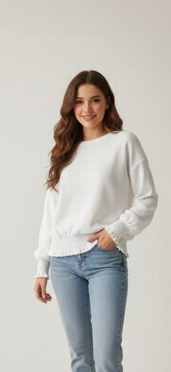 Beyaz pamuklu kazak, yuvarlak yaka ve uzun kolludur. Salaş kesimi ve normal midi boyuyla günlük rahat sokak stiline uygundur.