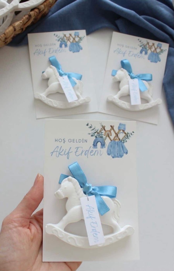 Pastel mavi kurdeleli, 'isim ‘ yazılı etiketli beyaz sallanan at hediyesi. Kartta 'HOŞ GELDİN' yazısı bulunur. İsteğe göre çoklu yapılır