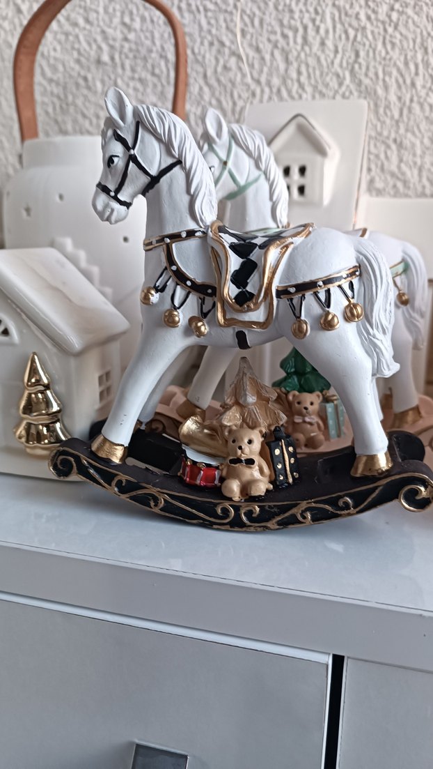 Altında küçük oyuncak ayılar ve hediyeler bulunan, altın ve siyah detaylı beyaz sallanan at biblosu.