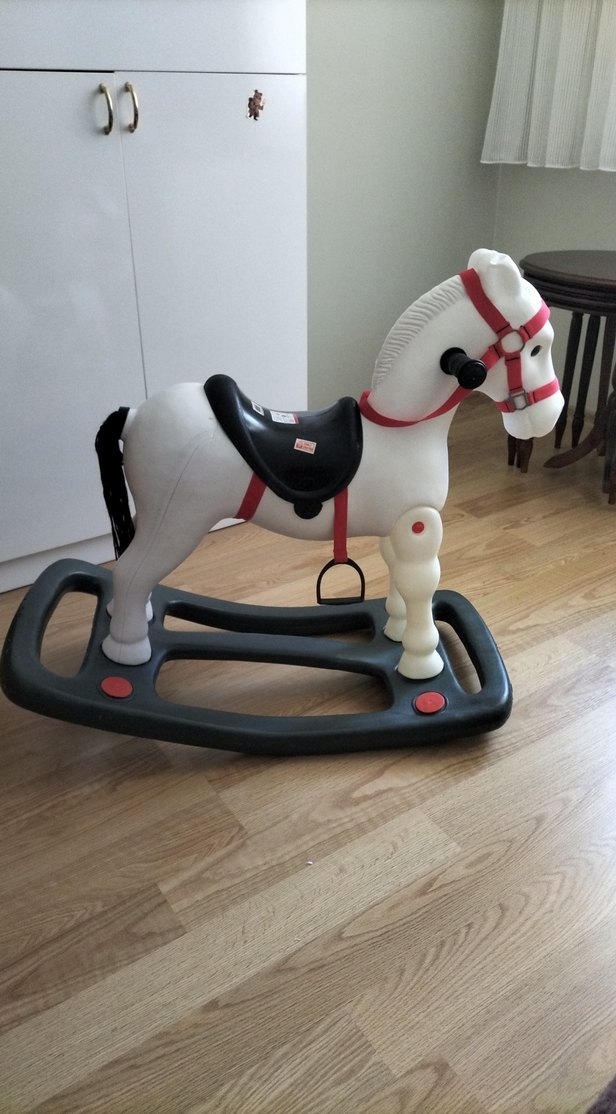 Gri tabanlı, kırmızı koşum detaylı beyaz sallanan at oyuncağı. Siyah eyer ve tutma kolları bulunur.
