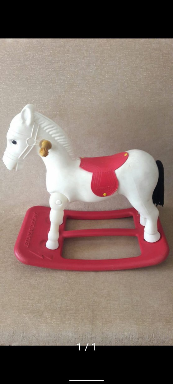 Kırmızı eyer ve tabanlı beyaz sallanan at oyuncak. Detaylı yele ve kuyruk içeren klasik bir çocuk oyuncağıdır.