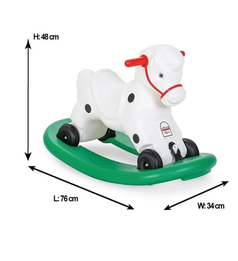 Kırmızı kulplu, siyah benekli beyaz sallanan at oyuncak. Ölçüleri 76 cm uzunluk, 48 cm yükseklik, 34 cm genişlik.