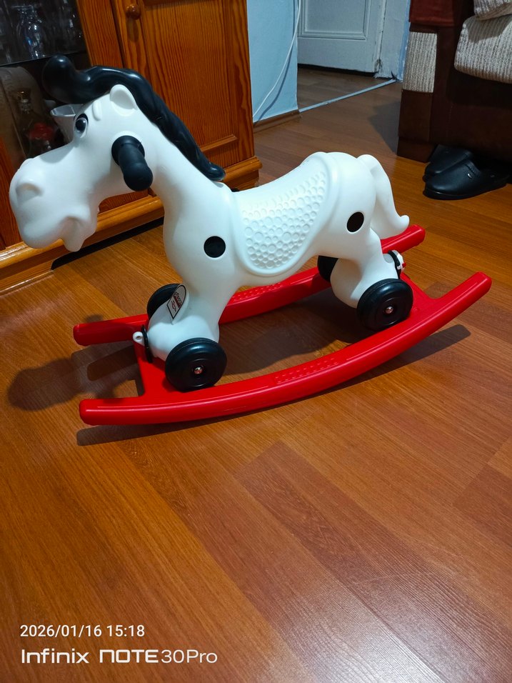 sıfır gibi tertemiz. Beyaz ve siyah kırmızı tabanlı renkli sallanan at oyuncak, çocuklar için sallanarak eğlence sağlar. alttaki kırmızı aparatı çıkıyor. bisiklet olarakta kullanılabilir