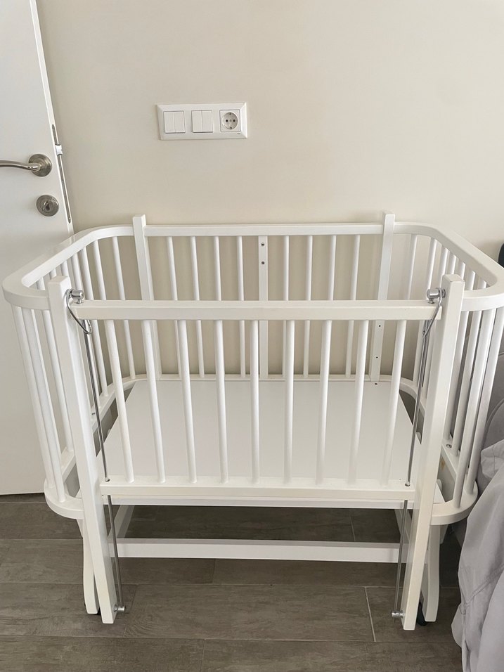 Gri tabanlı beyaz beşik, hafif sallanma için tasarlanmış. Dayanıklı çerçeve ve sade, temiz görünüme sahip. ️ mobilya beşik sallanıyor sakarya içi satışı vardır