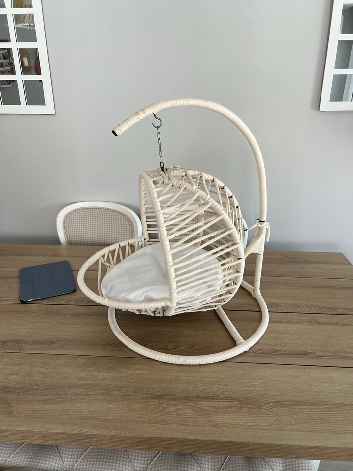 Beyaz sallanan bebek sepeti, kıvrımlı çerçeve ve yumuşak minder ile konforlu bir dinlenme alanı sağlar.
