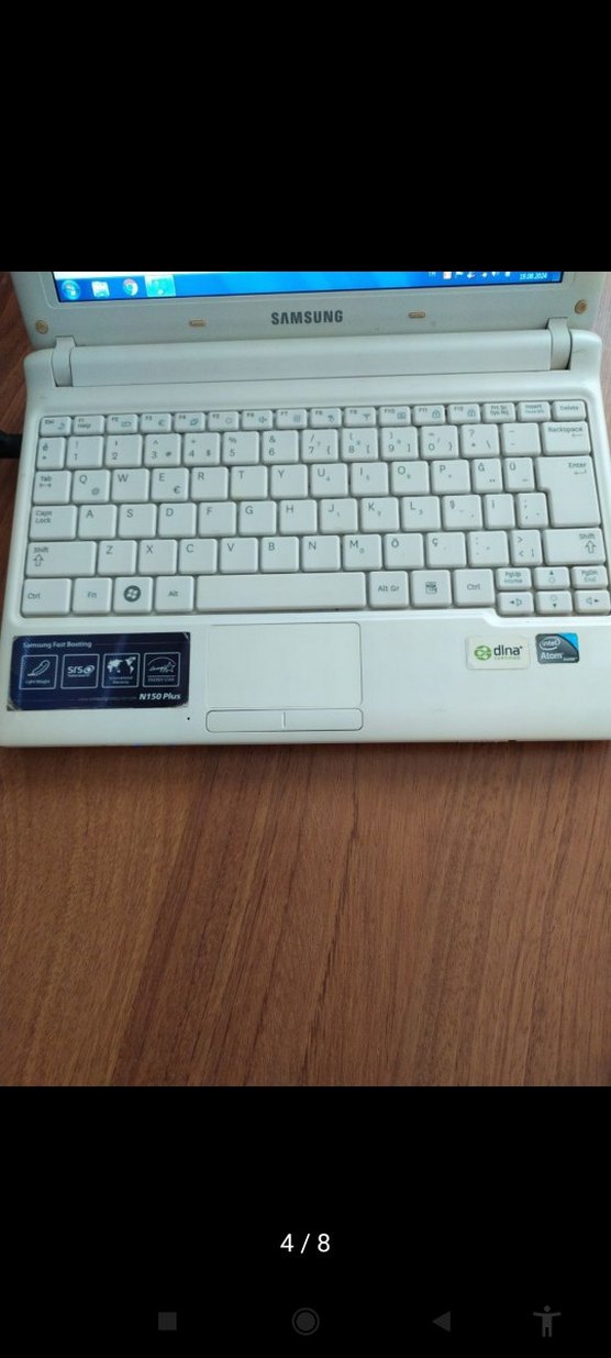 Beyaz renkte Samsung marka laptop, tam klavye ve dokunmatik yüzey ile günlük kullanım için uygundur. sarz bitip sarz olurken çalışıyor mini notebook