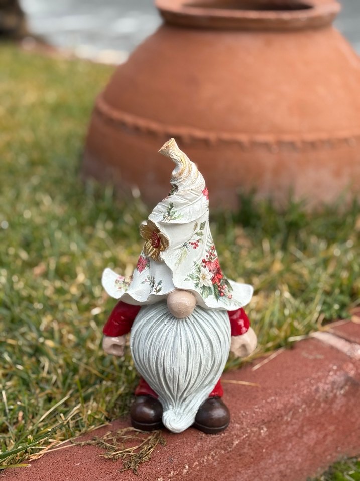 Gri sakallı ve çiçek desenli beyaz şapkalı cüce dede figür.