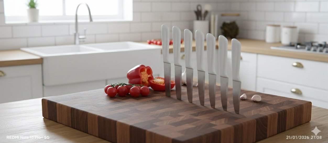 Çeşitli mutfak işleri için beyaz saplı ve gri bıçaklardan oluşan set.